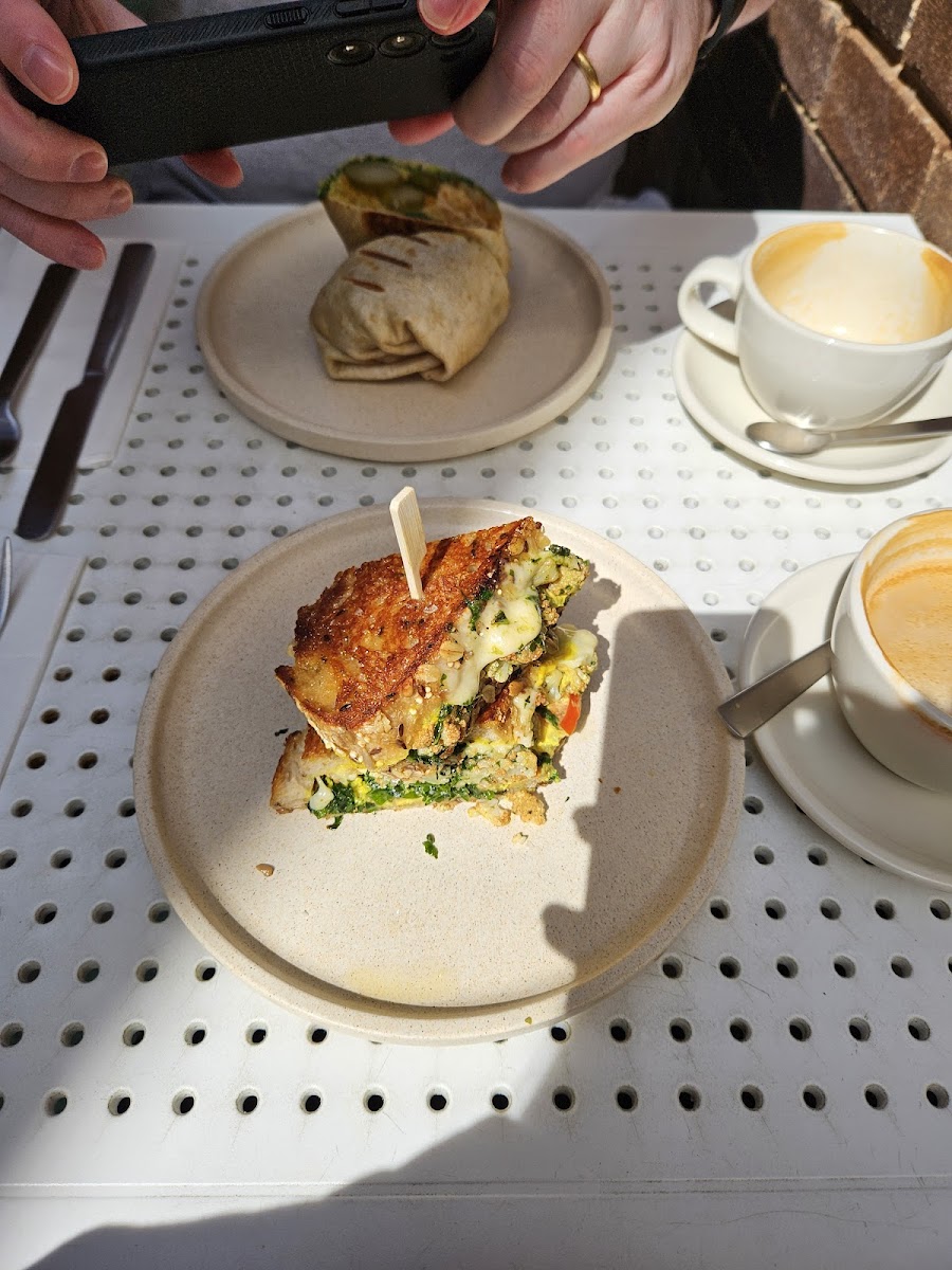 Food-wise, the menu avoids the usual café clichés, featuring items like eggplant shakshuka, cauliflower grilled cheese, and tofu scrambled eggs. There’s also a particular attention to hearty, plant-focused dishes and snacks such as a large vegan falafel wrap with hummus or the Turra Bowl for those seeking a satisfying and wholesome meal. The presence of gluten-free and dairy-free baked goods, including banana loaves and macadamia cookies, reflects a thoughtful approach to dietary needs without compromising on flavour.